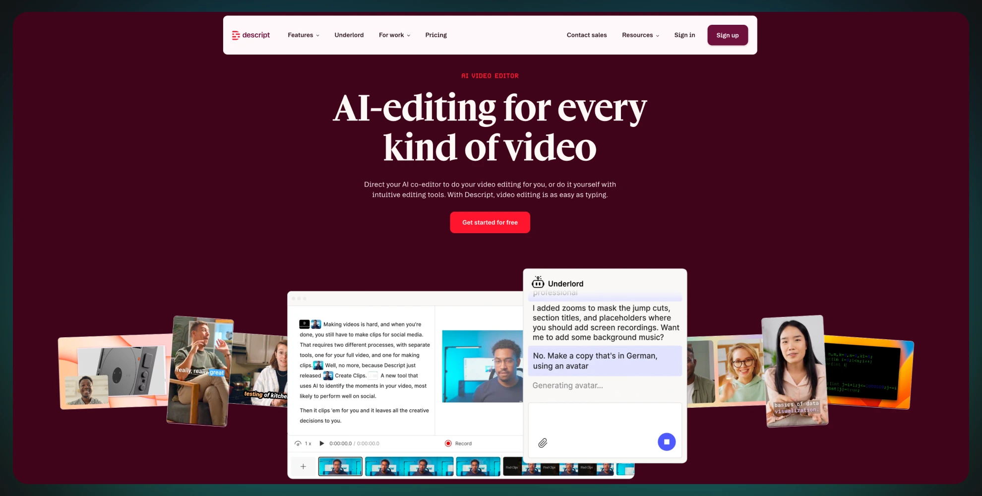 Descript is a strong option for transcript-first editing and long-form workflows, especially for spoken content. Even if you don’t use it as your primary editor, transcript-based workflows are powerful for content reuse because they help you identify the best moments and rewrite them into multiple short-form posts.