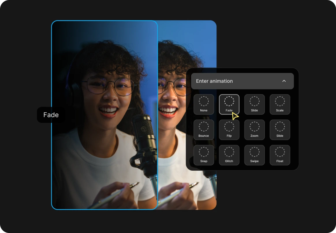 Say goodbye to hard cuts. Add smooth transitions to clips with enter/exit animations that make your edits feel cinematic. Choose from subtle fades to dynamic slides, all adjustable inside the video panel.